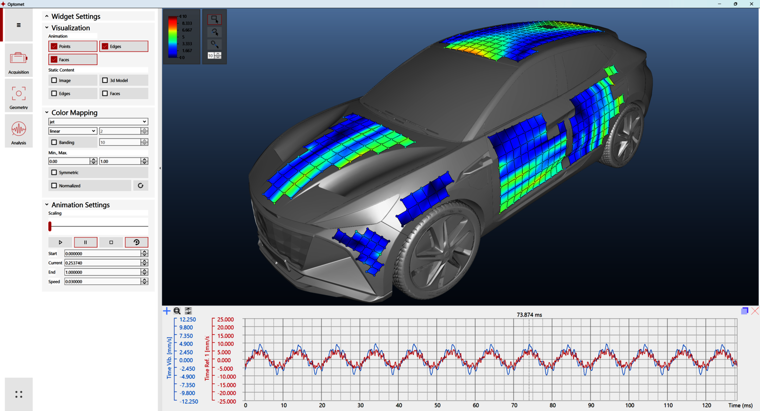 * 可扫描实时测量振动速度/位移/加速度的时域波形及频谱,对物体表面的振动信号进行时域及频域成像。
